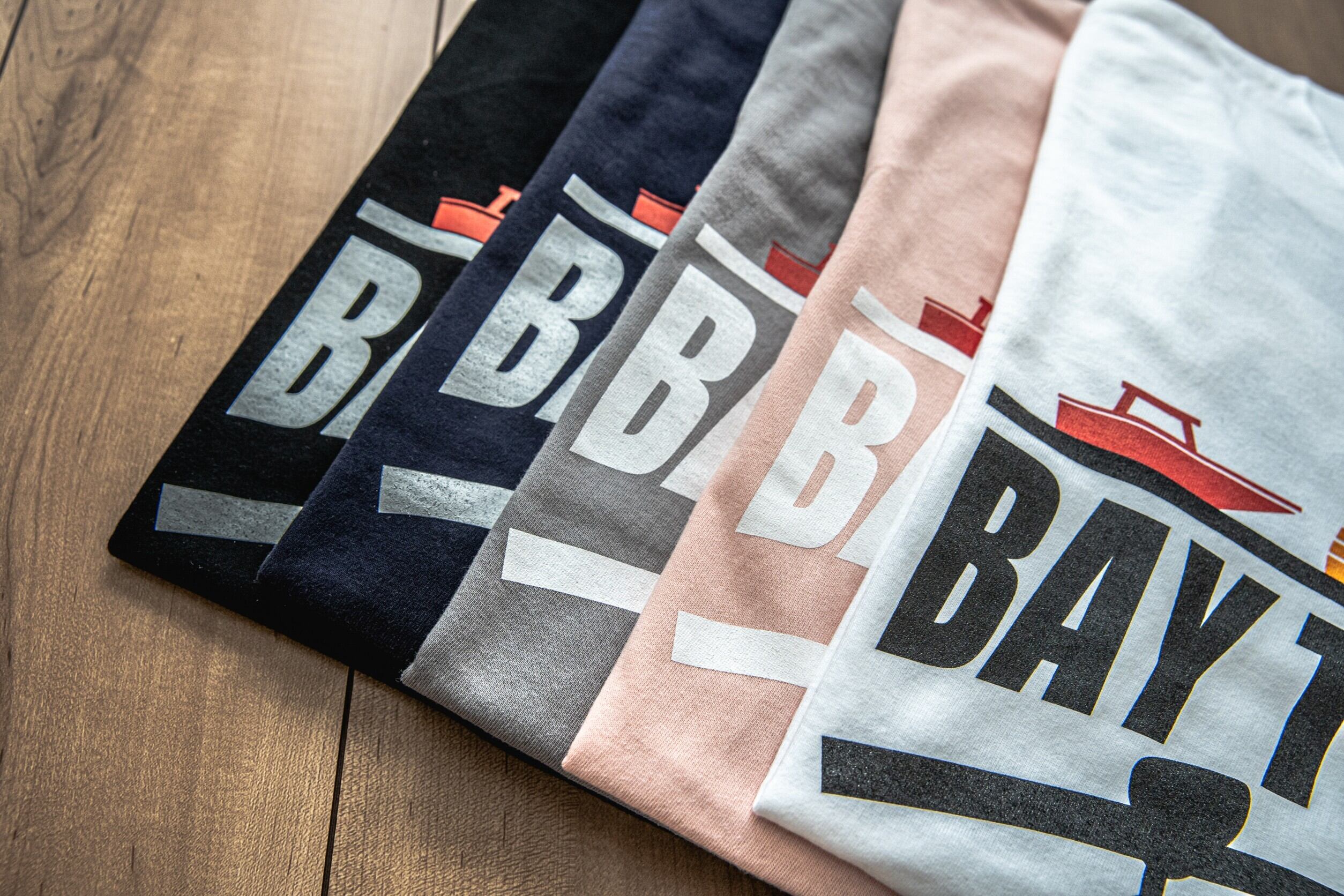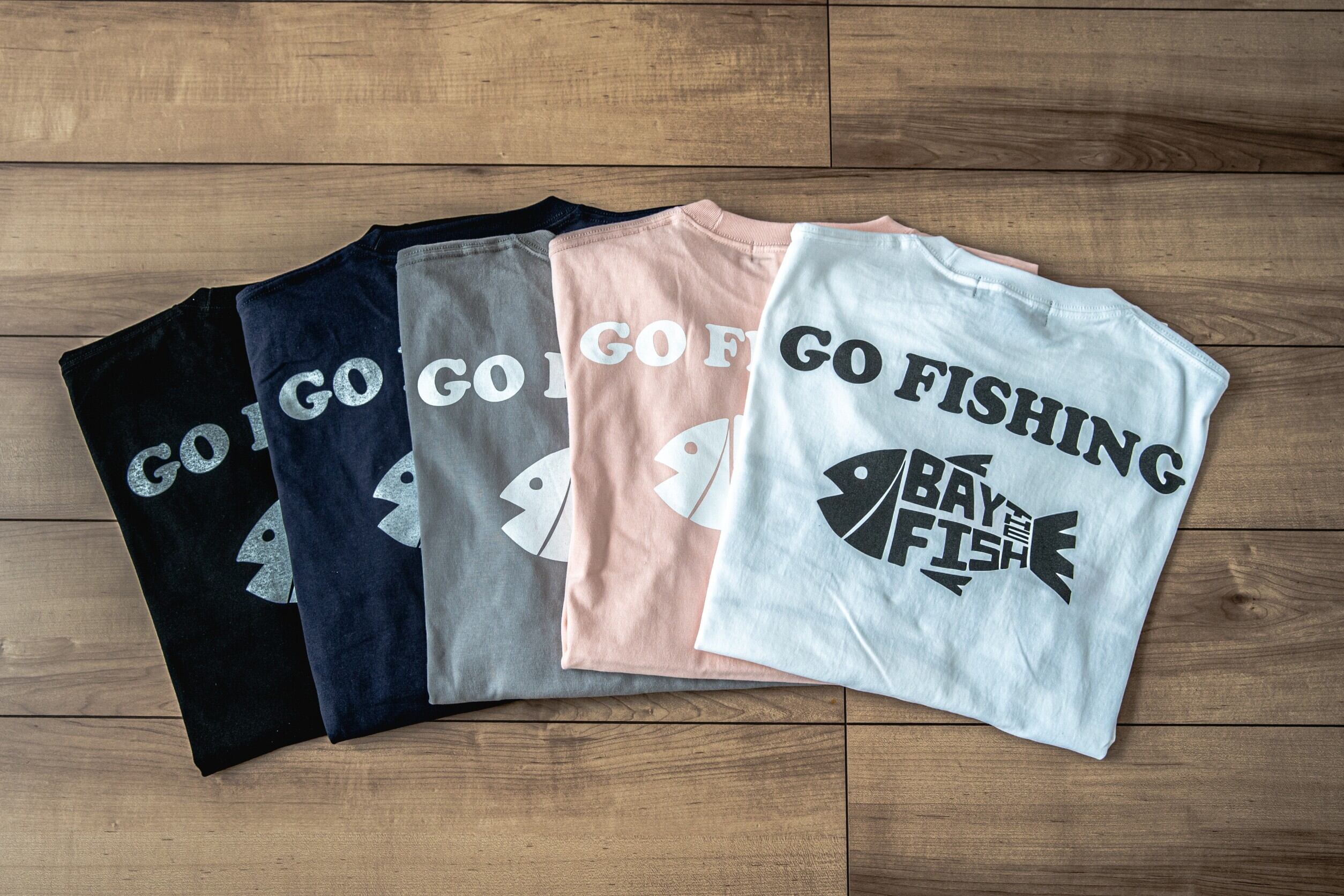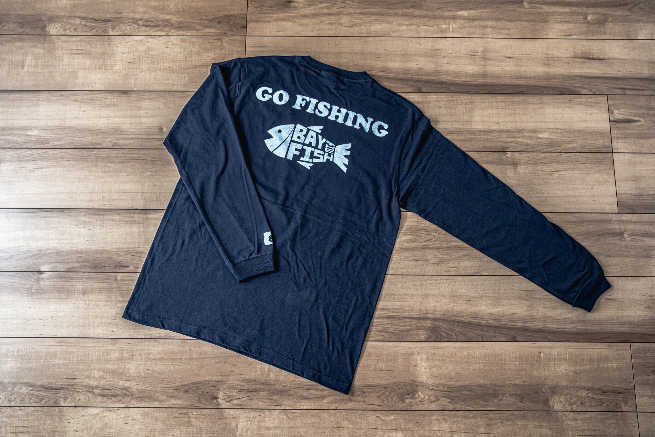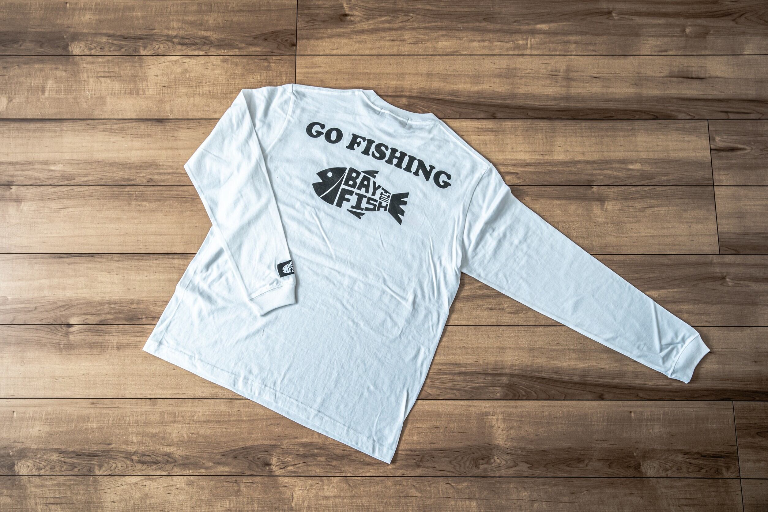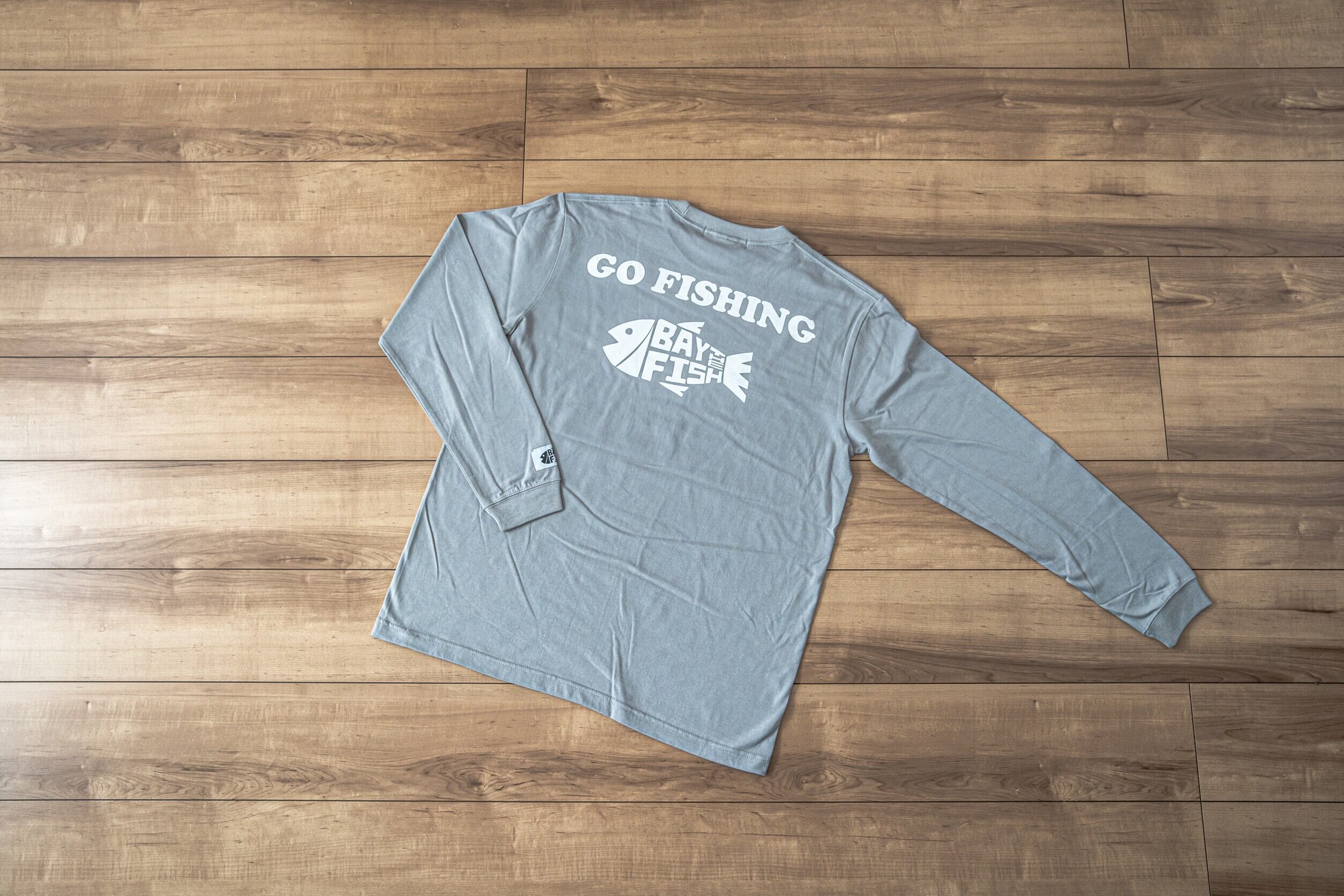 前にはBAY THE FISHの大きなロゴ、後ろには釣り人と一目でわかるBAY THE FISHのお魚ロゴ+GO FISHINGをデザインした5.6オンス ロングスリーブ BIG PRINT TEE。
