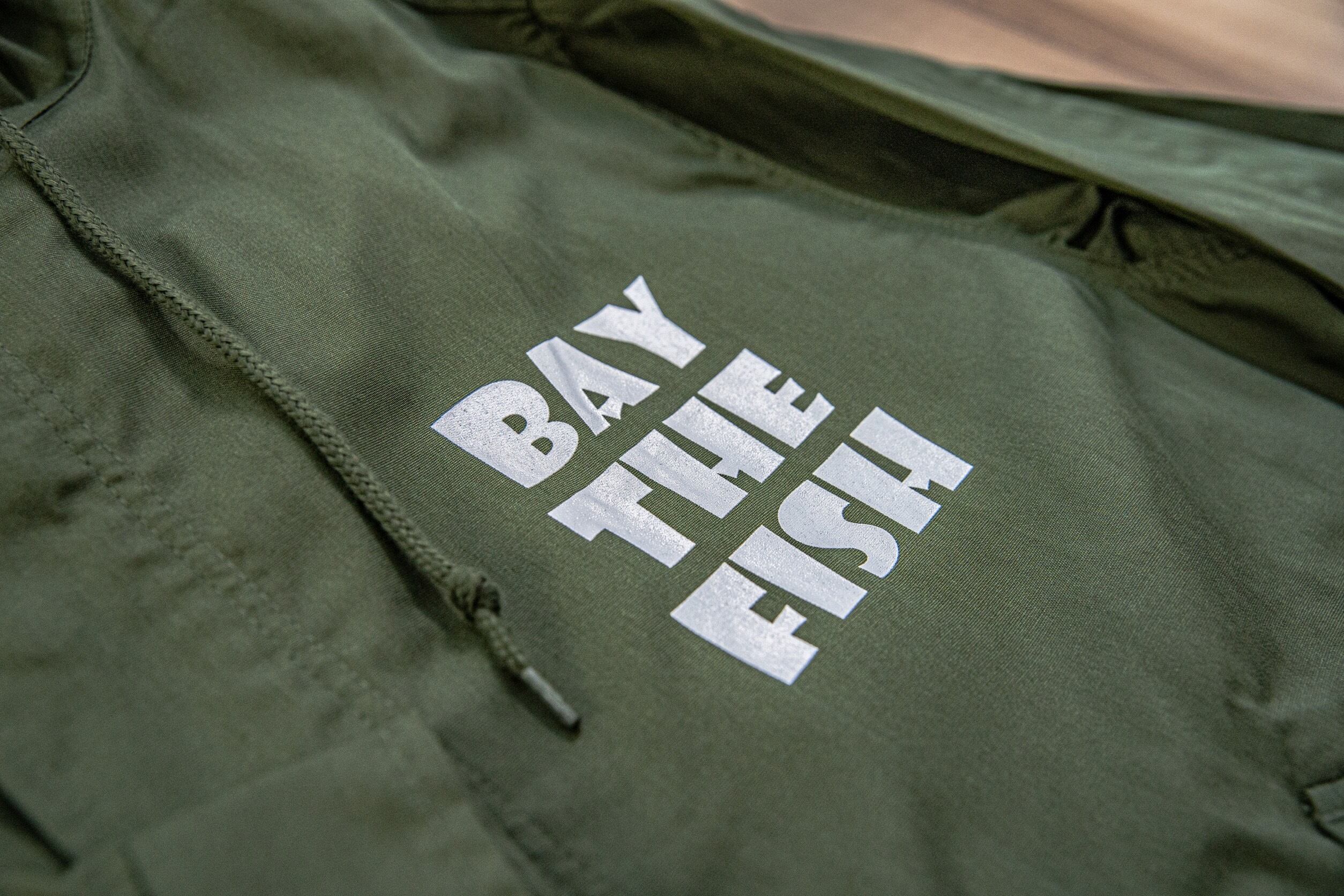 胸元にBAY THE FISHのNEWロゴと袖にタグのみを配置したシンプルでオシャレなデザイン。