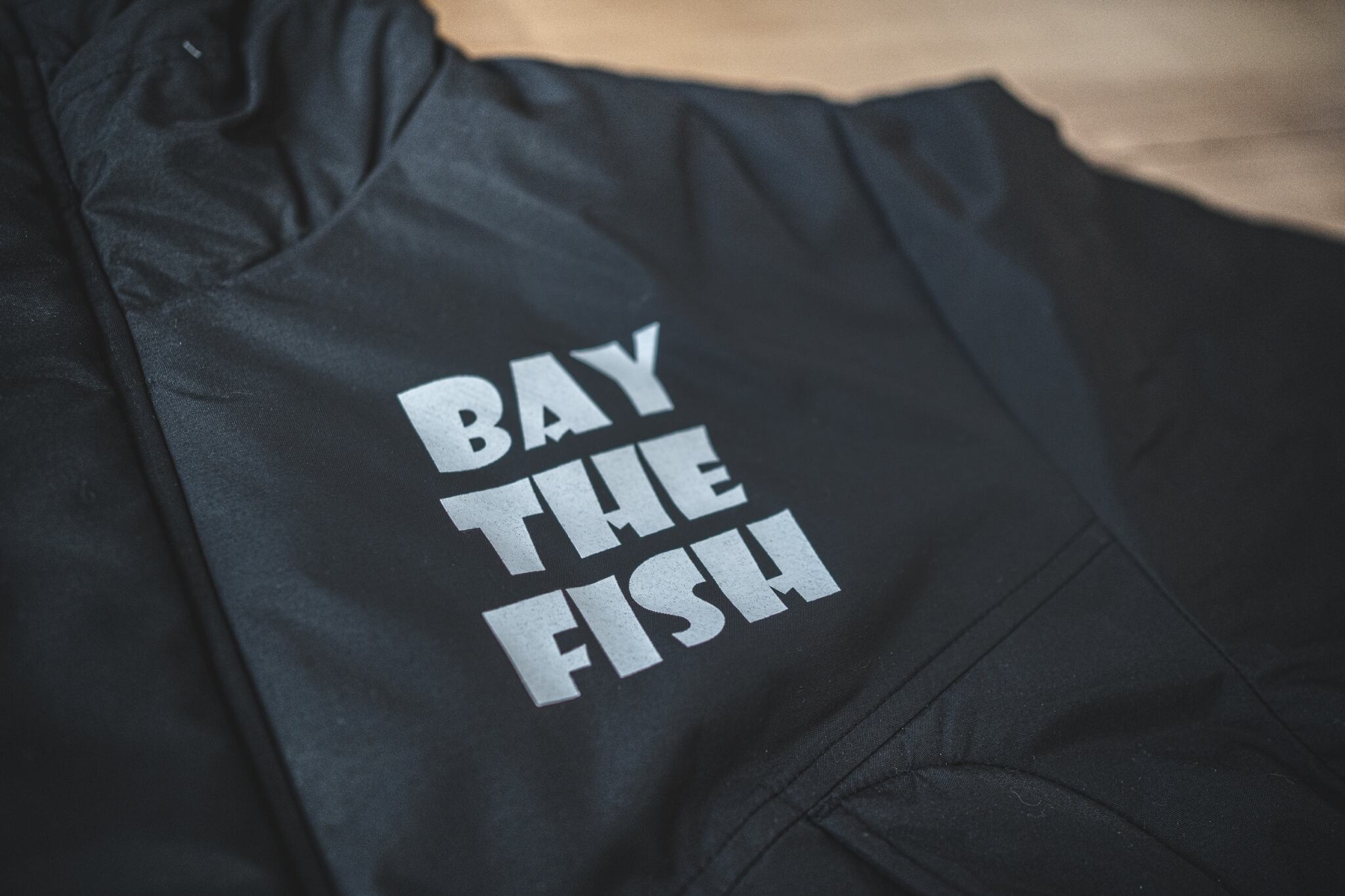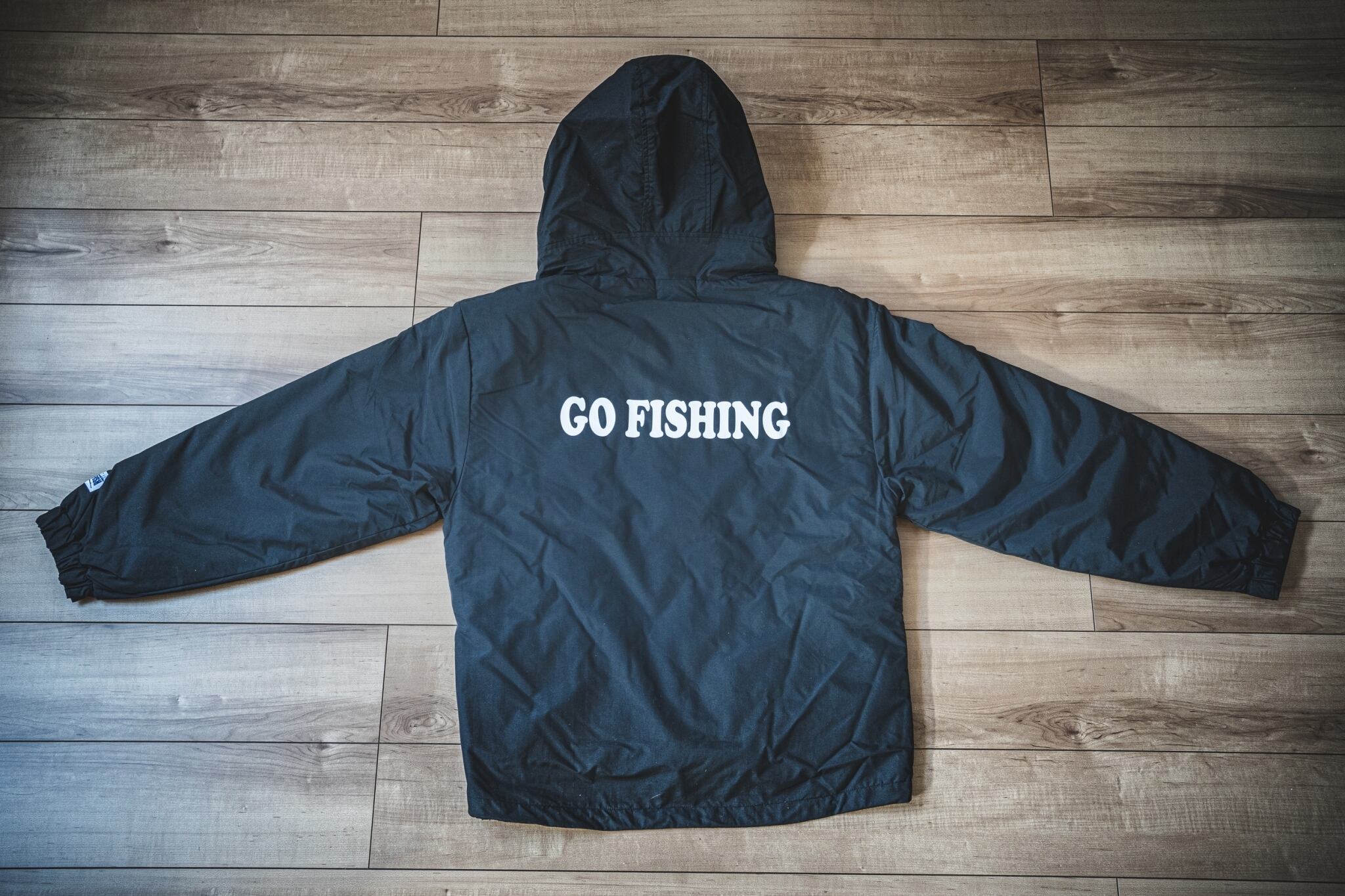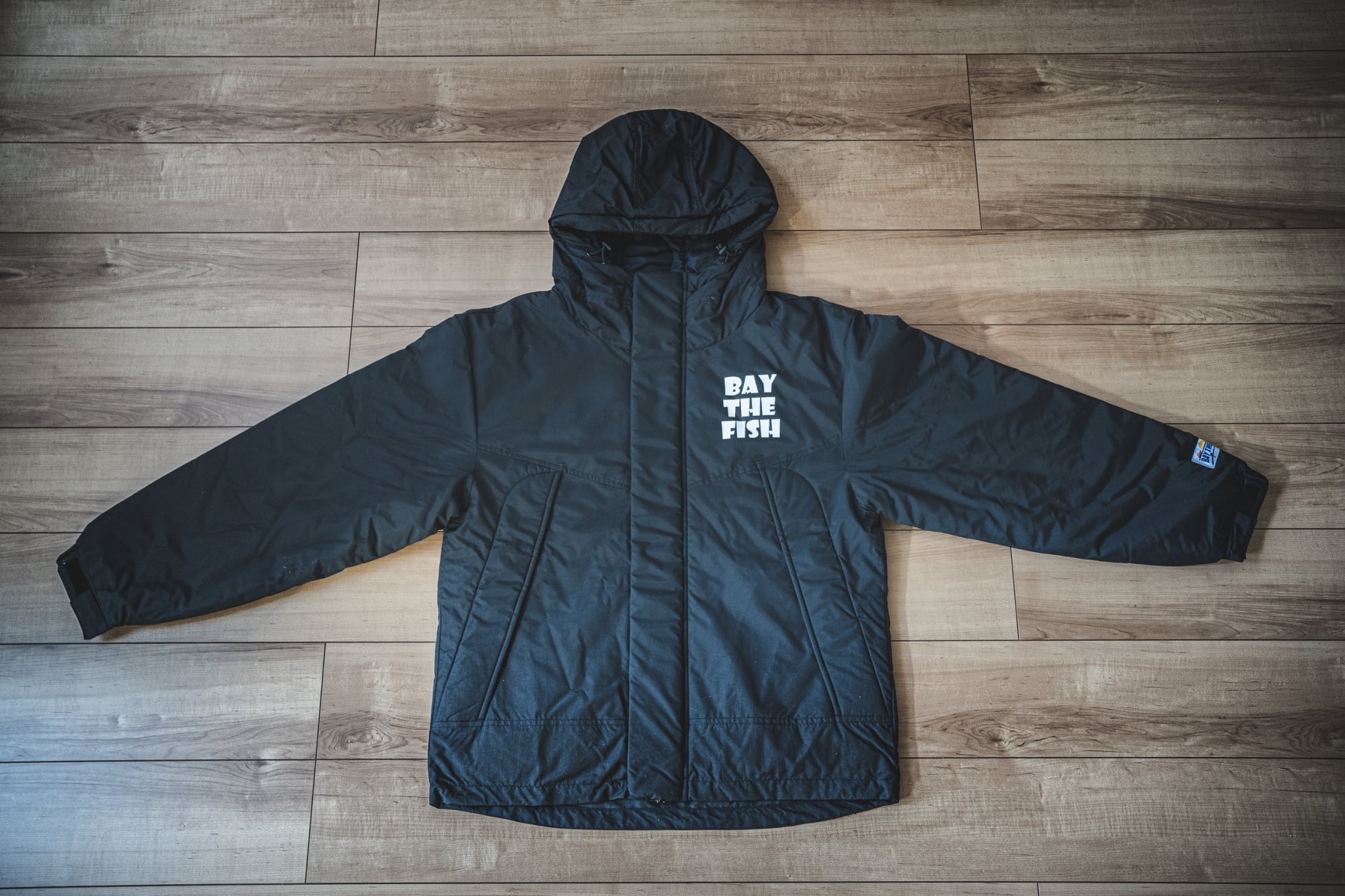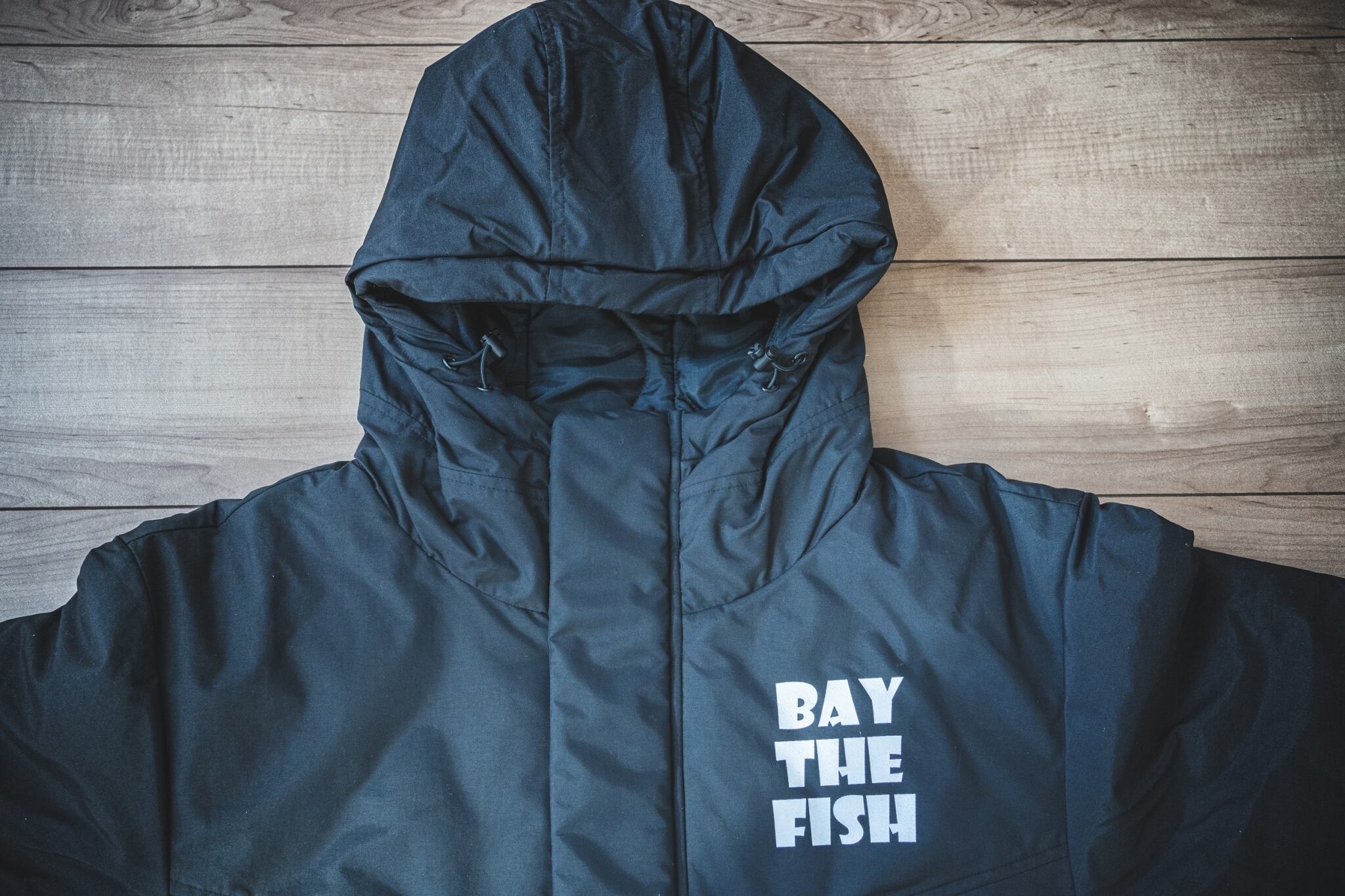 前にはBAY THE FISHロゴ、後ろにはGO FISHINGプリントをデザインした防寒シェルパーカーにしました。