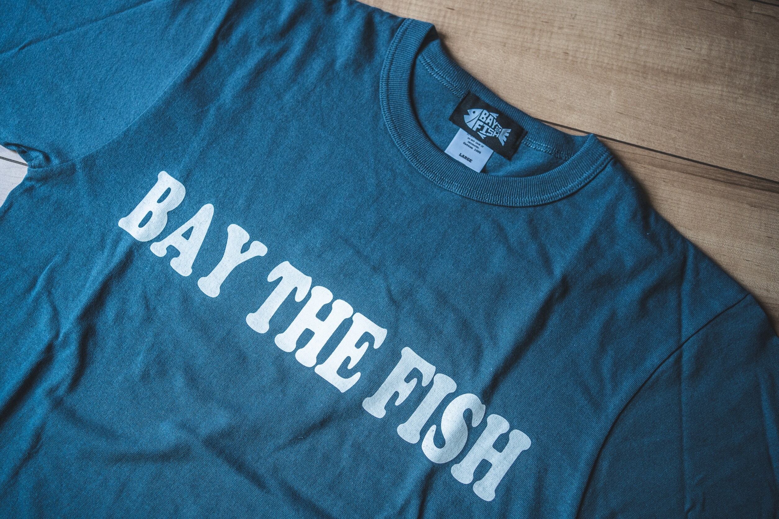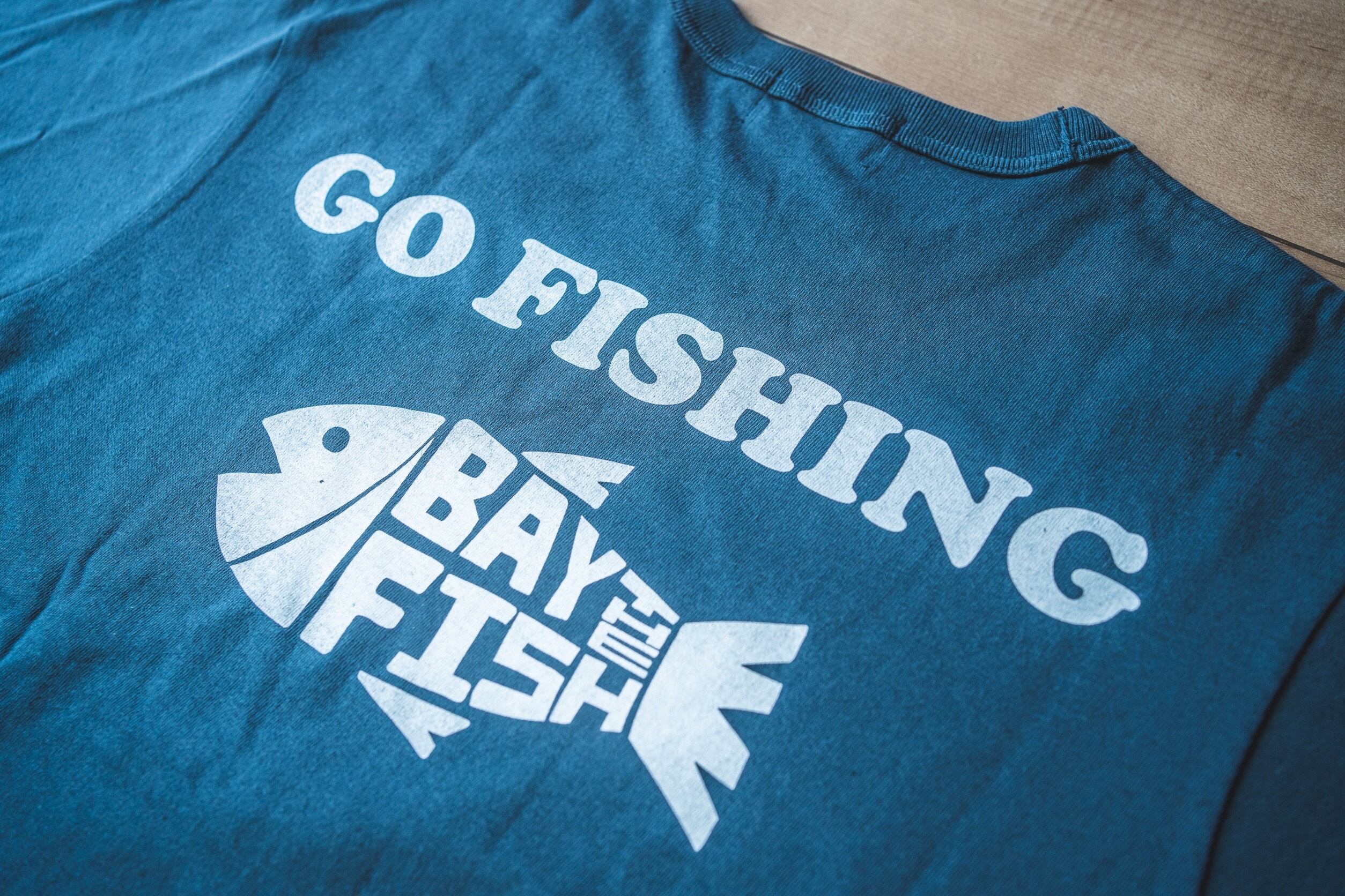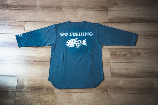 前は、シンプルでカッコイイBAY THE FISHの文字。後ろには、BAY THE FISHロゴ+GO FISHNGのデザイン。