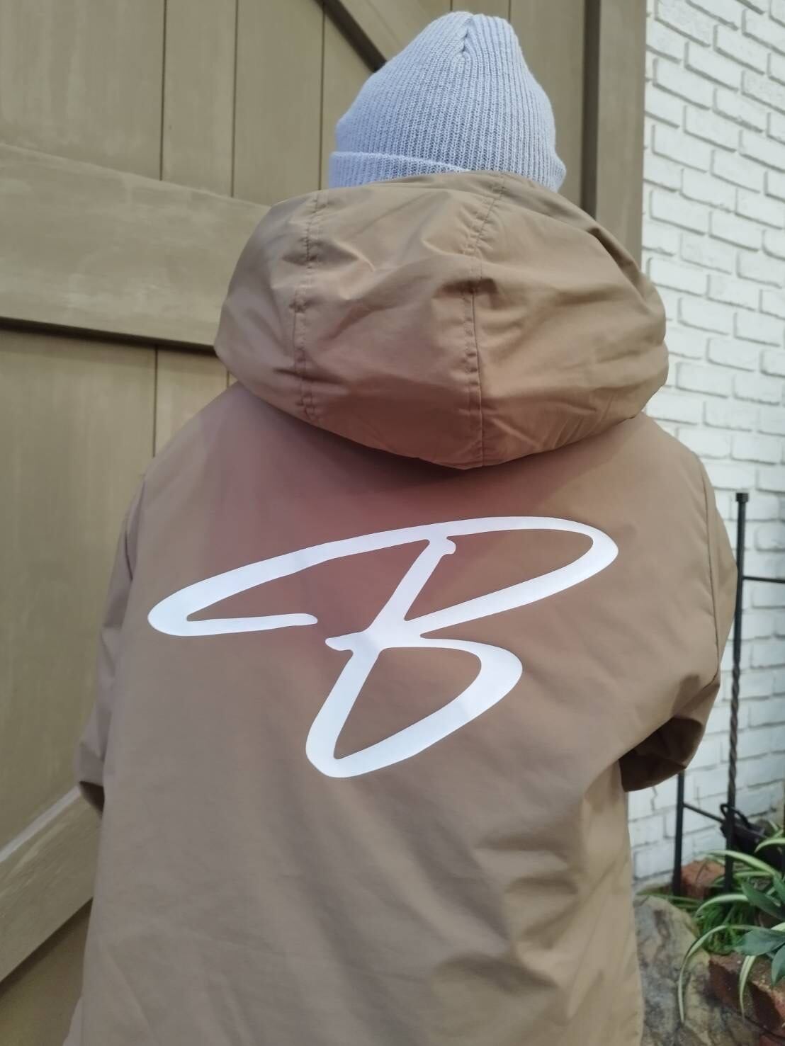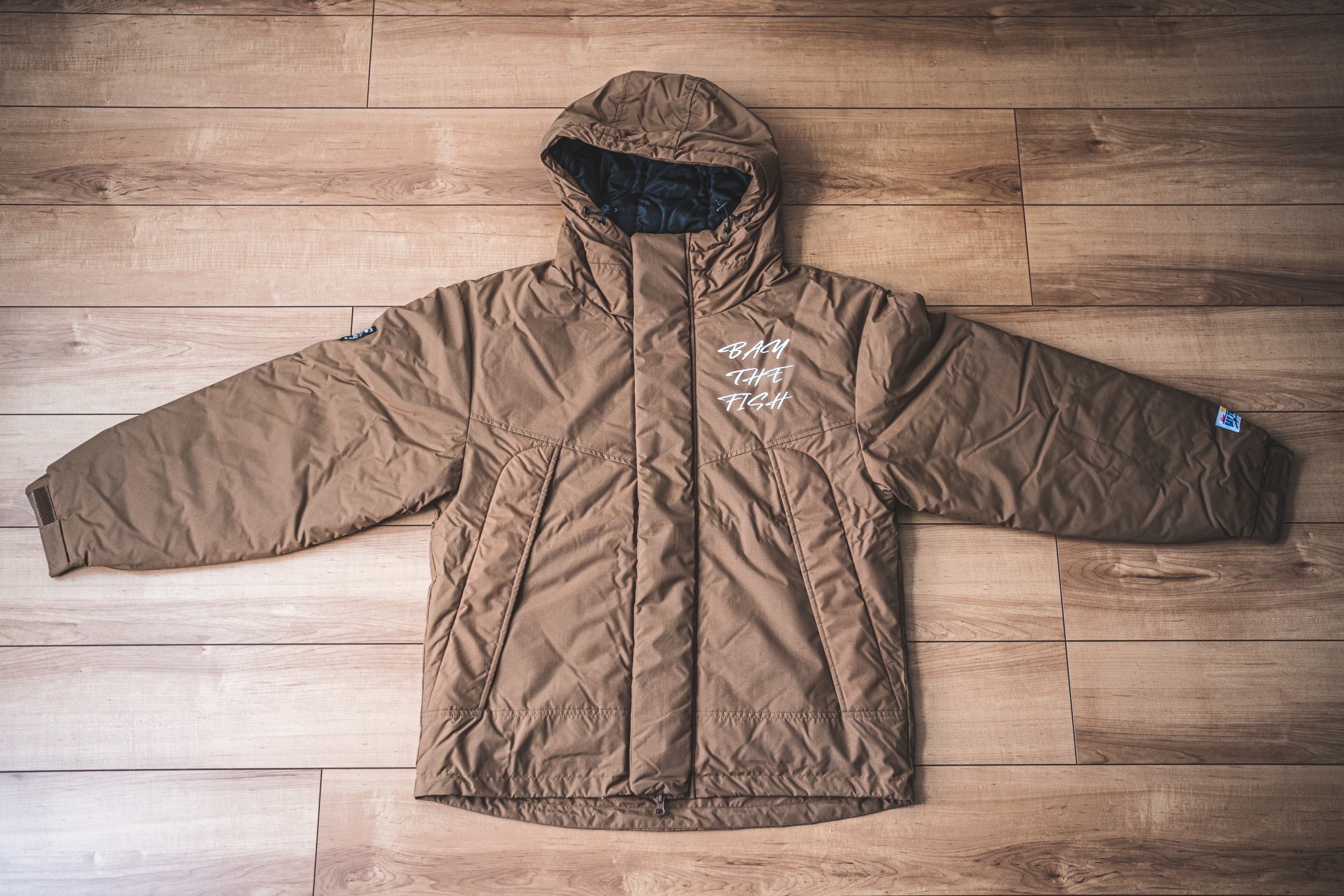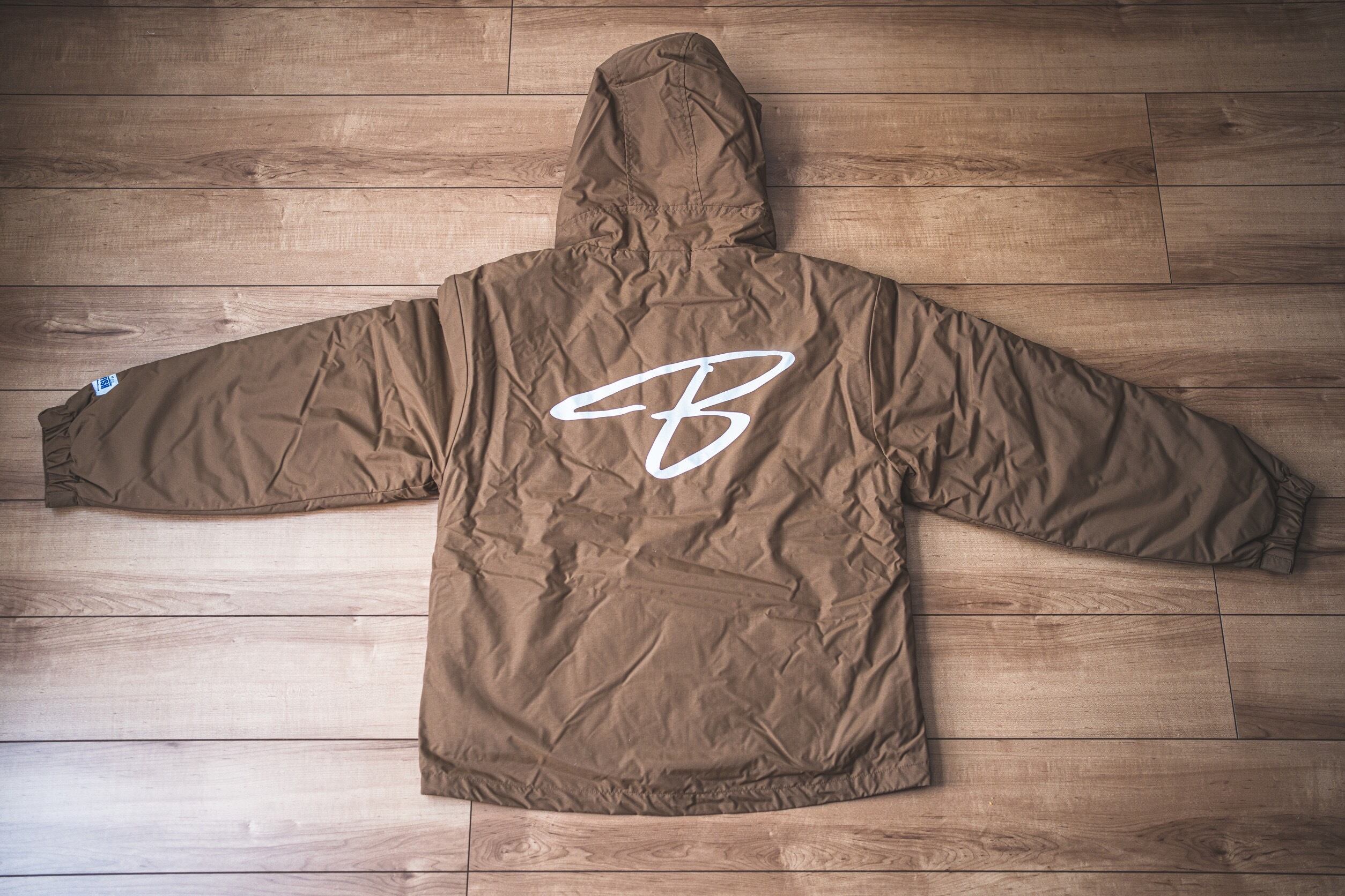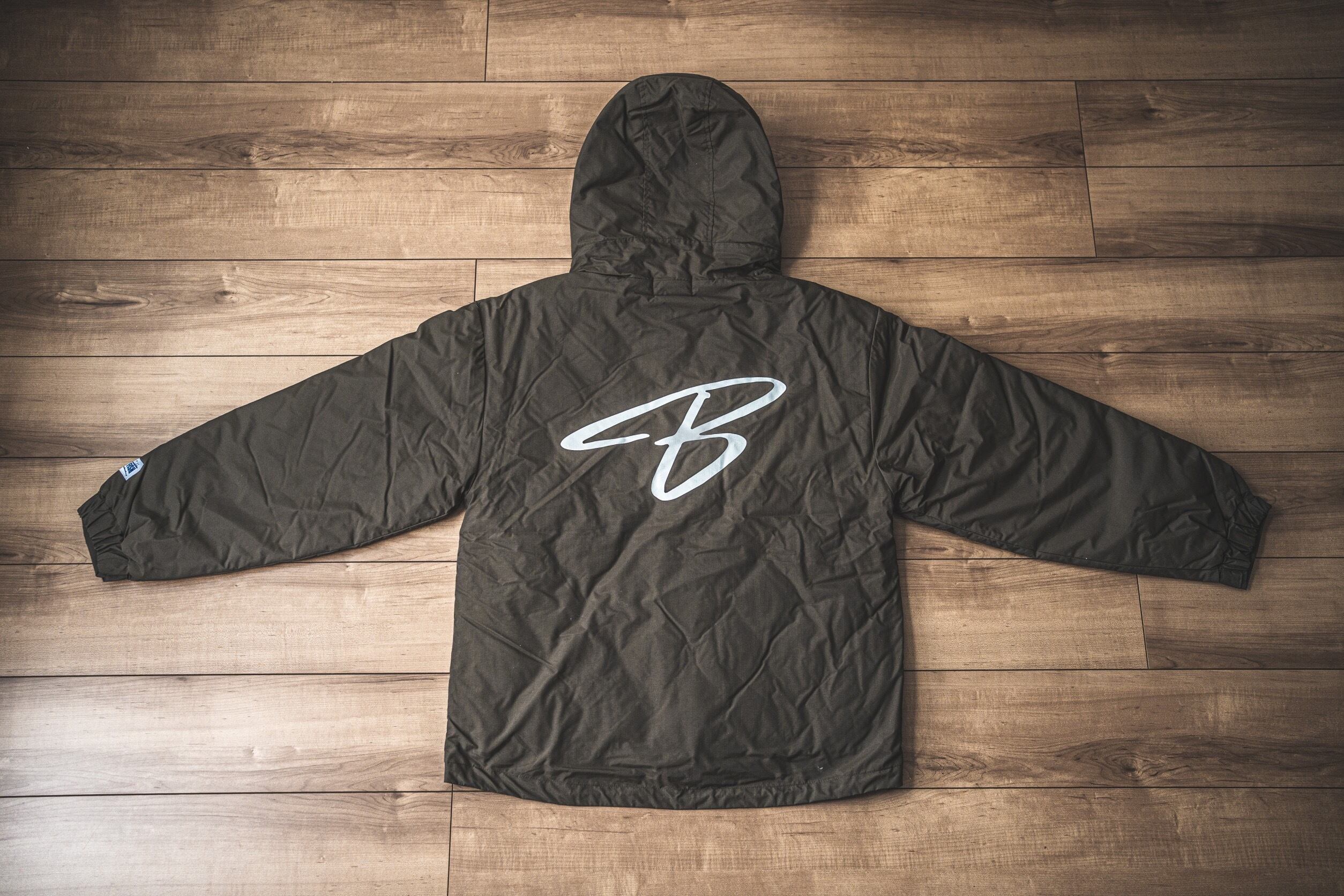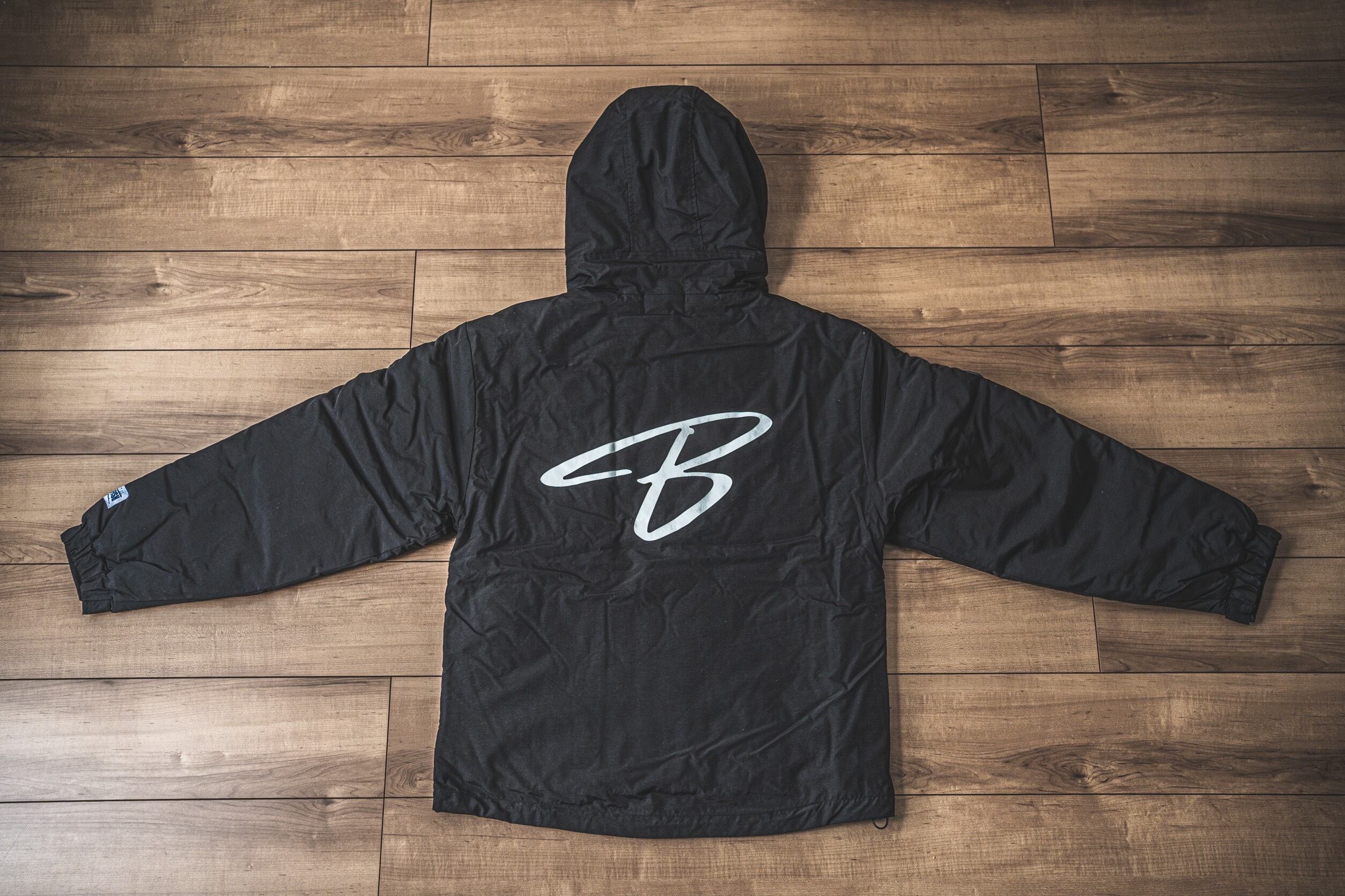 大好評の左胸元のシンプルなBAY THE FISHロゴ、背中にはBAY THE FISHの『B』でカッコ良くデザインした防寒シェルパーカーにしました。