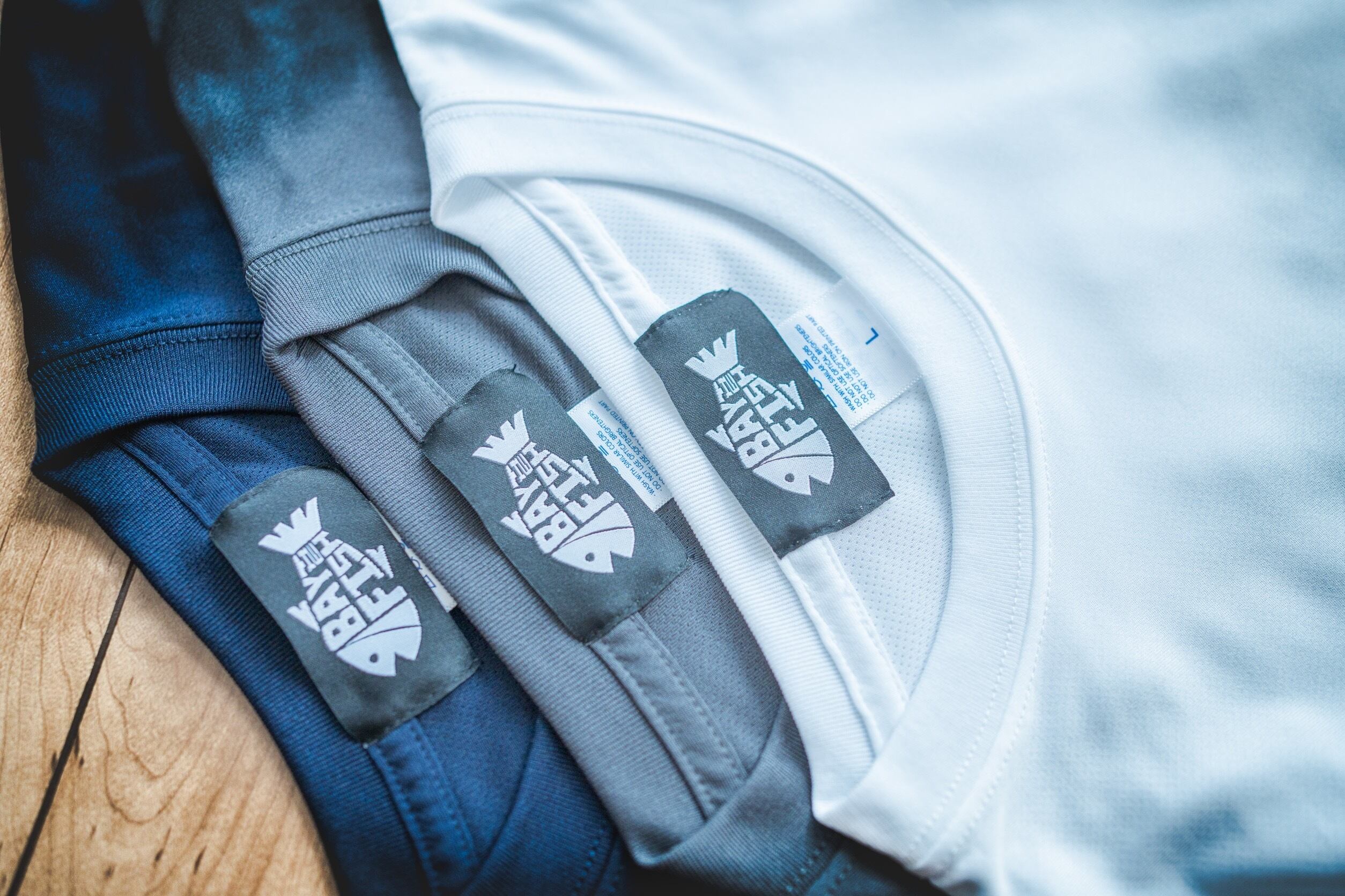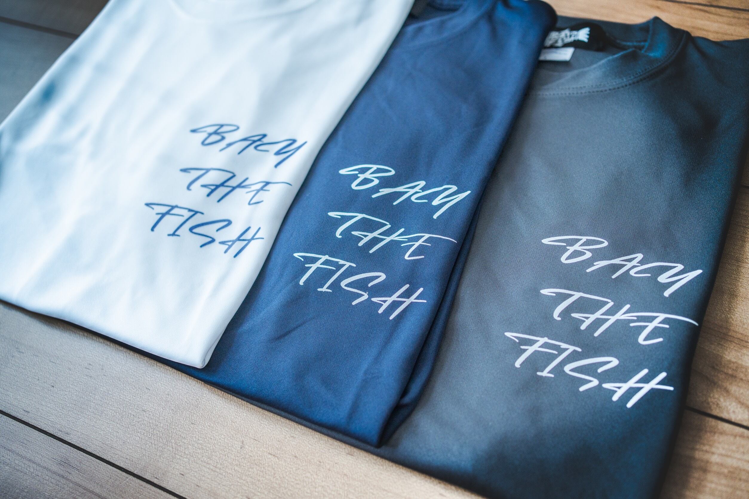 BAY THE FISHの定番デザインとなった左胸元にシンプルなBAY THE FISHロゴ、背中にはBAY THE FISHの『B』でカッコ良く仕上げました。
