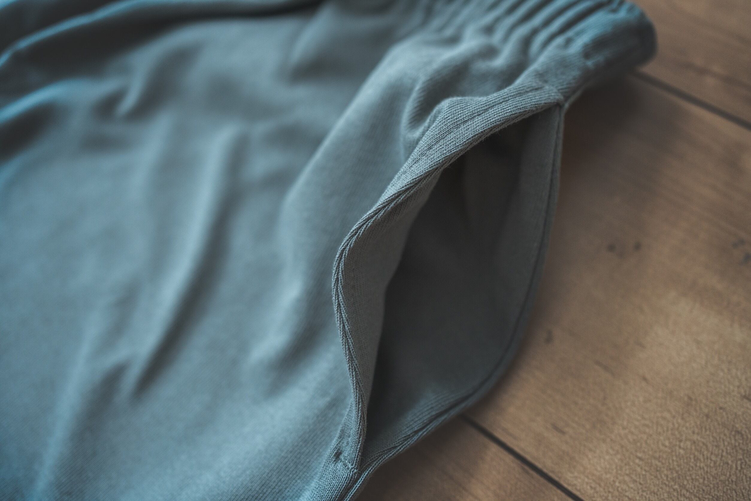 ウエストひもはヴィンテージ感のある平ひも仕様とし、粗めのステッチワークなどディテールにもこだわり抜いたことで、古き良きアメリカンなリラクシングウェアの雰囲気を存分にまとった一枚となりました。